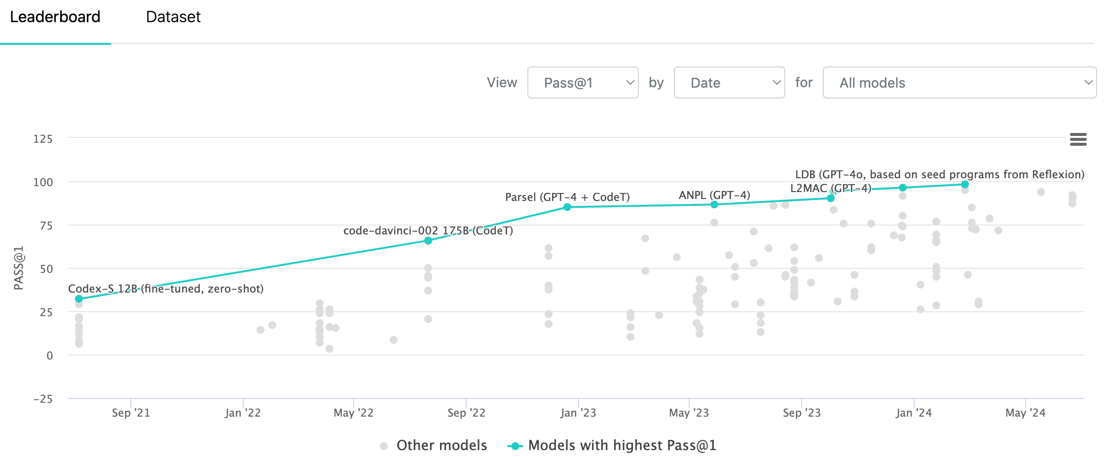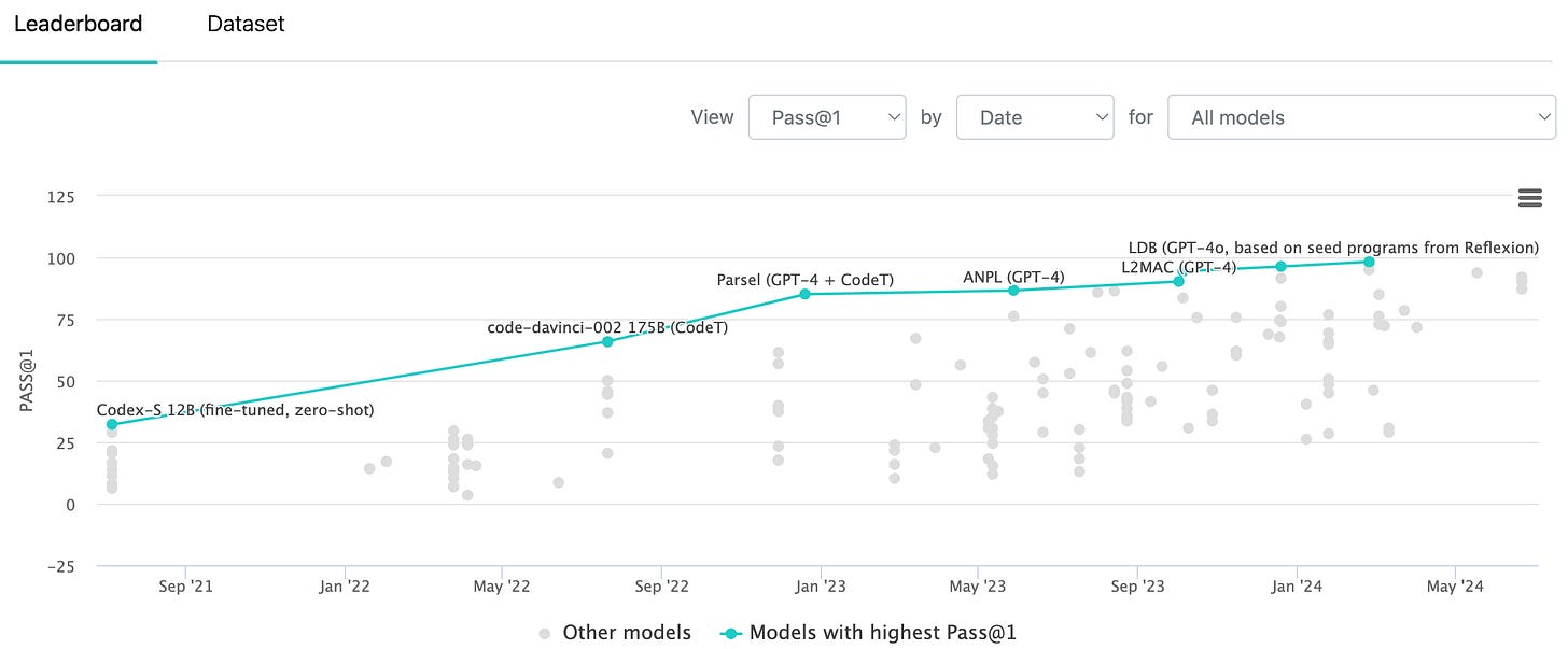 The foregoing shows the progression of scores from various models on the benchmark set HumanEval. Introduced in 2021, HumanEval is a set of 164 programming problems with natural language specifications and unit tests. The same paper introduced Codex, a model that solves (that is, generates code from the specifications that passes the unit tests) 28.8% of the problems. As of this writing, the state of the art is a model called Language Model Debugger that solves 98.2% of the problems, a rate so high that HumanEval is losing its utility for evaluation.