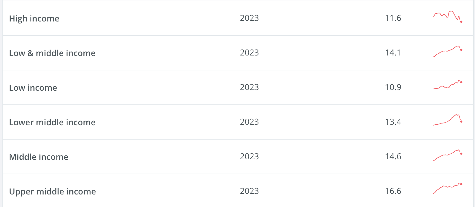 If we read history sideways, then it stands to reason that since countries get wealthier over time, then wealthy countries must have have higher youth unemployment than poorer countries. However, from the World Bank again, there is no obvious income/unemployment relationship.