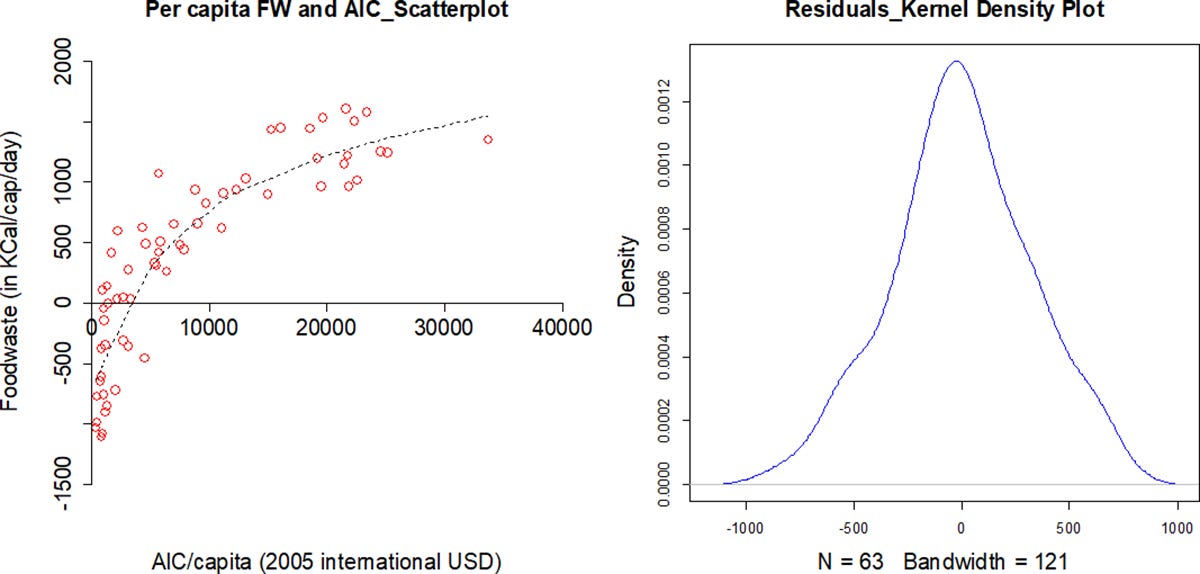 The first problem is that, when one subtracts two quantities with noise, the result is extremely noisy. Look at the plot on the left here, from van den Bos Verma et al., which shows national per capita income and estimated food waste for various countries.