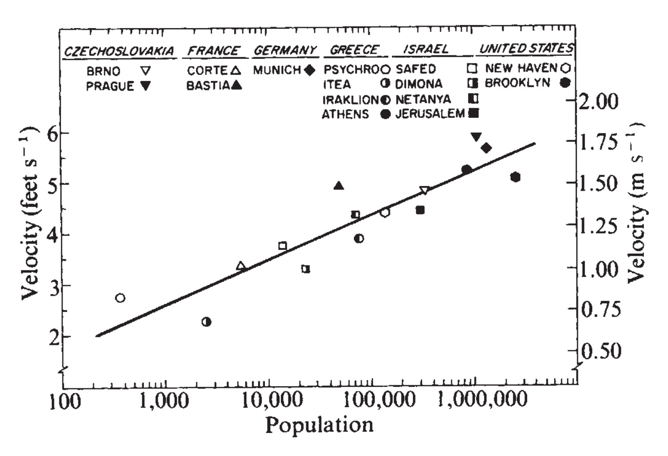 We’ll start with a famous paper, Bornstein and Bornstein (1976), which finds a linear relationship between the log of city size and average walking speed.