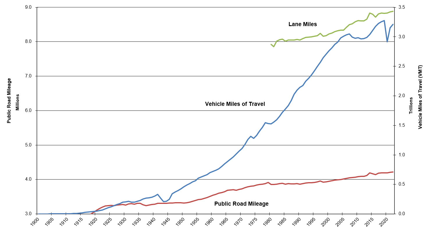 On my Scaling in Human Societies project, I wrote a more extended version of a post I did here a few weeks ago on the rebound effect in transportation. In that post, I included an image showing how vehicle-miles traveled is greatly outpacing road capacity. Here is a more recent version of that figure from the Federal Highway Administration.